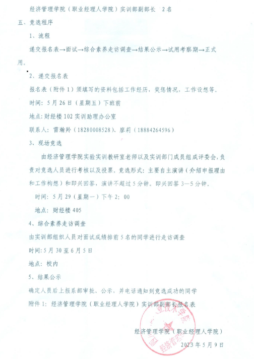 关于澳门太阳集团6138(职业经理人学院)实训部副部长竞选的通知